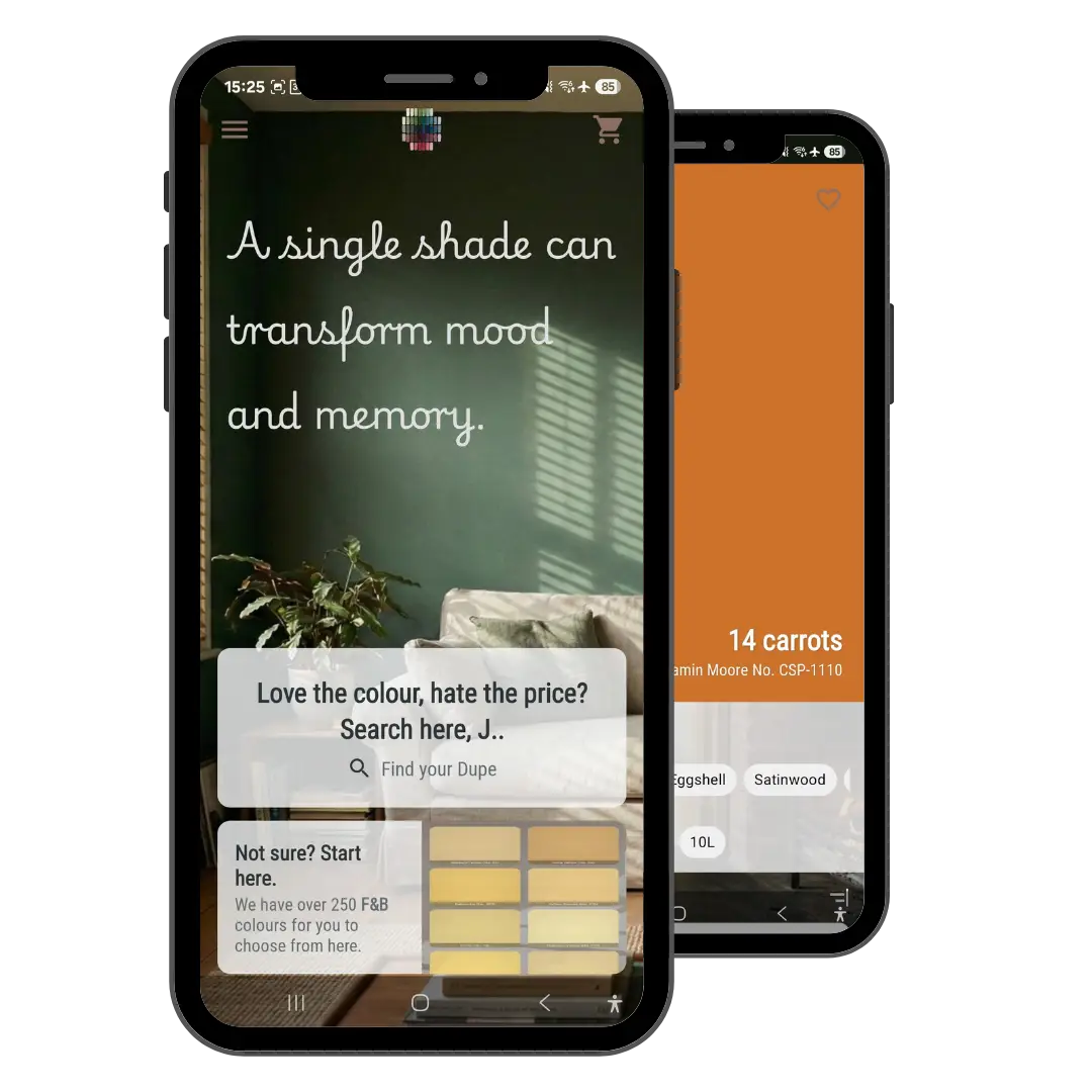 Type in the shade you’ve fallen in love with — Farrow & Ball, Little Greene, Sherwin-Williams, Craig & Rose, and more. DupeCoat instantly pulls up the exact colour so you don’t have to rely on screenshots, swatches, or memory.